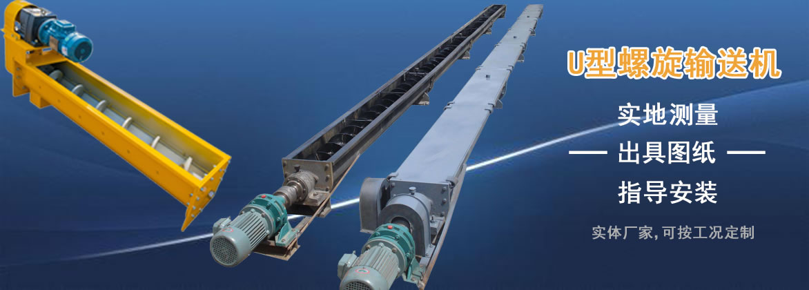 U型螺旋输送机主要由动力装置、头部装配、U型机壳、无轴螺旋体或无轴螺旋体、耐磨衬板、进料口、出料口、机盖(需要时)、底座等组成。