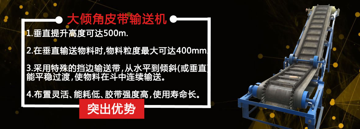 DJ型大倾角皮带输送机与普通式输送机、斗式提升机、刮板输送机比较其综合技术性能都非常优越.输送量大可达6000m3/h垂直提升高度可达500m.在垂直输送物料时物料粒度较大可达200mm,从水平到倾斜(或垂直)能平稳过渡,能耗低、结构简单、维护方便、皮带强度高、使用寿命长.